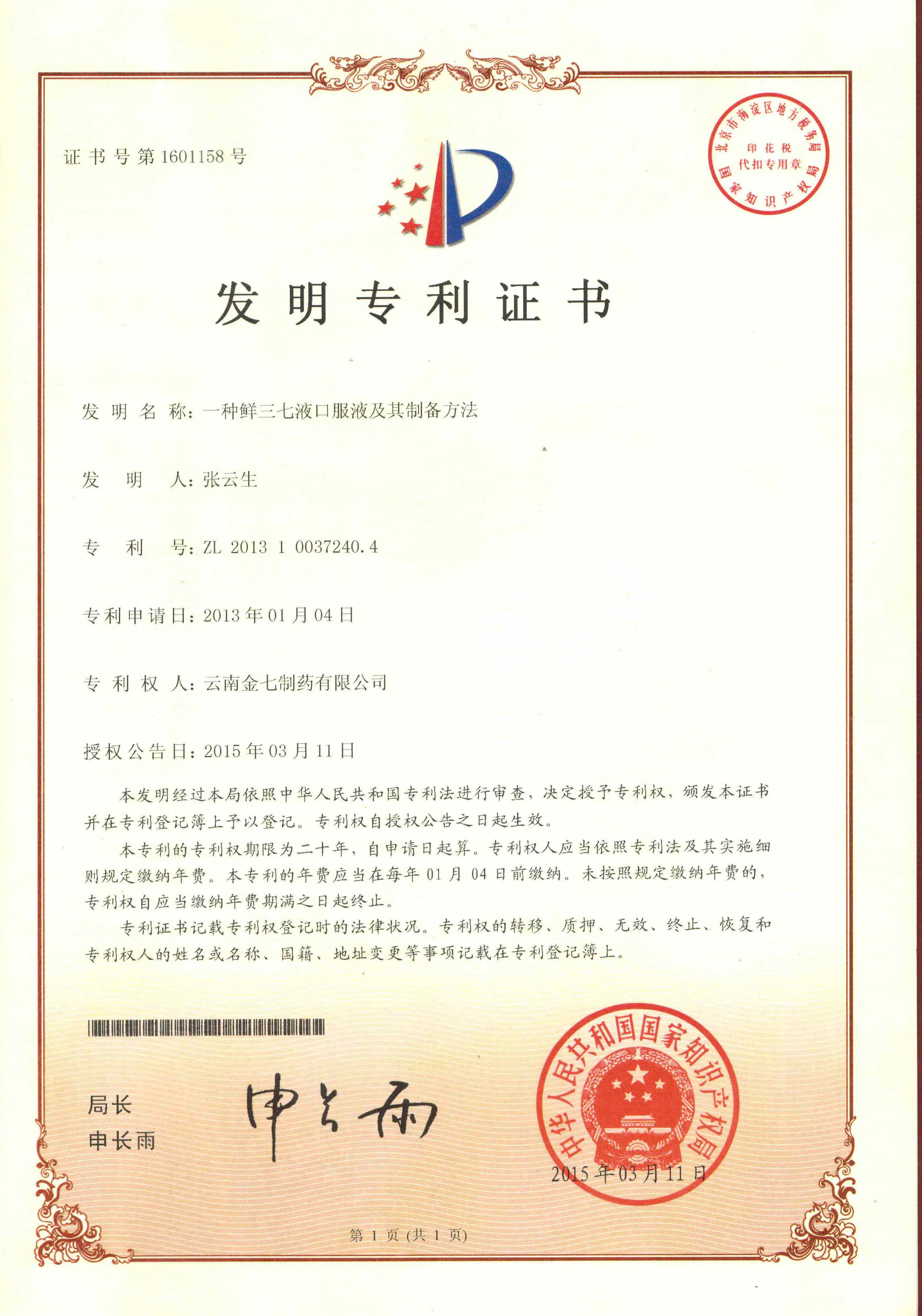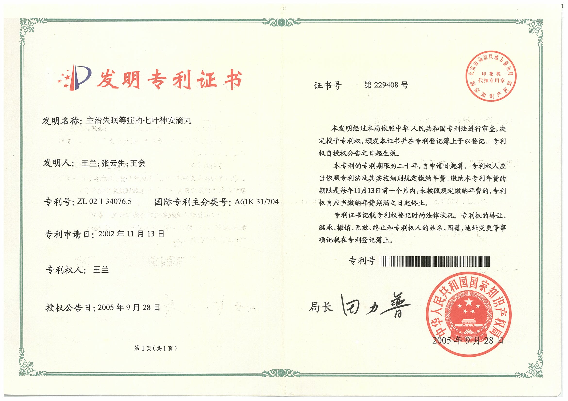 打造企業(yè)的持續(xù)發(fā)展競爭力。通過多年的努力,公司申報了專利55項、獲得專利授權(quán)33項,取得國家新藥證書1個,藥品生產(chǎn)批準(zhǔn)文號8個,保健食品批準(zhǔn)文號2個,其中藥品七葉神安滴丸、保健食品三七口服液為全國獨家專利品種。